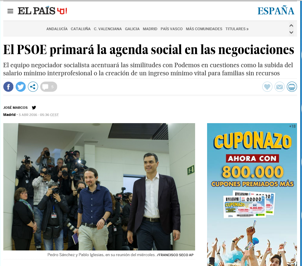 El PSOE tambi茅n parece razonar despierto. Est谩 dispuesto a negociar los programas sociales con Podemos. Era su punto d茅bil. A la vista de las relaciones, todo le aconseja radicalizarse algo m谩s de la mano de Podemos. Si lo dejan solo con Ciudadanos, ir铆a cediendo al peso del conservadurismo, dej谩ndose llevar y podr铆a encontrarse sin percibirlo en el infierno mismo de la alianza maligna con el PP, con el que tanto se desama y desune.