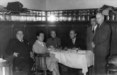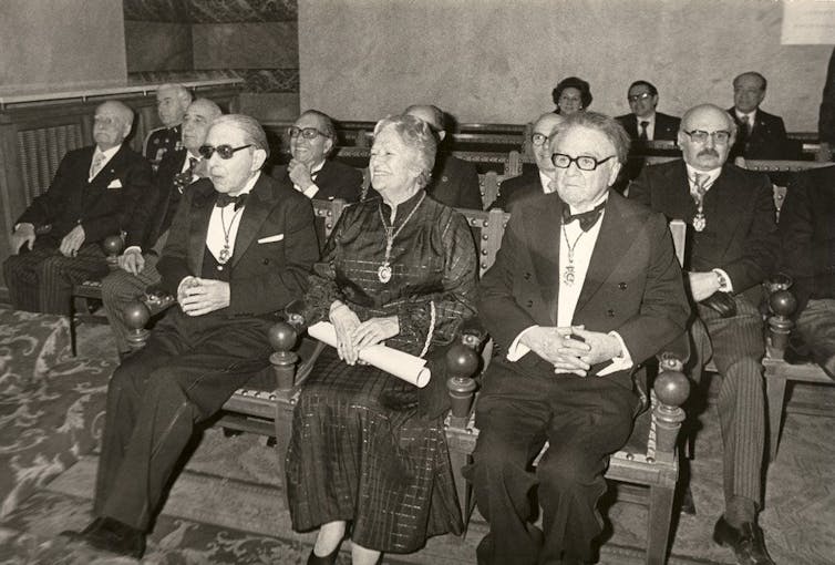 En el acto de su ingreso en la Real Academia Espa帽ola. De izquierda a derecha, Gonzalo Torrente Ballester, Carmen Conde y Manuel de Ter谩n. En la fila posterior, Emilio Alarcos y Rafael Lapesa. Madrid, 28 de enero de 1979. Patronato Carmen Conde-Antonio Oliver / Pinterest