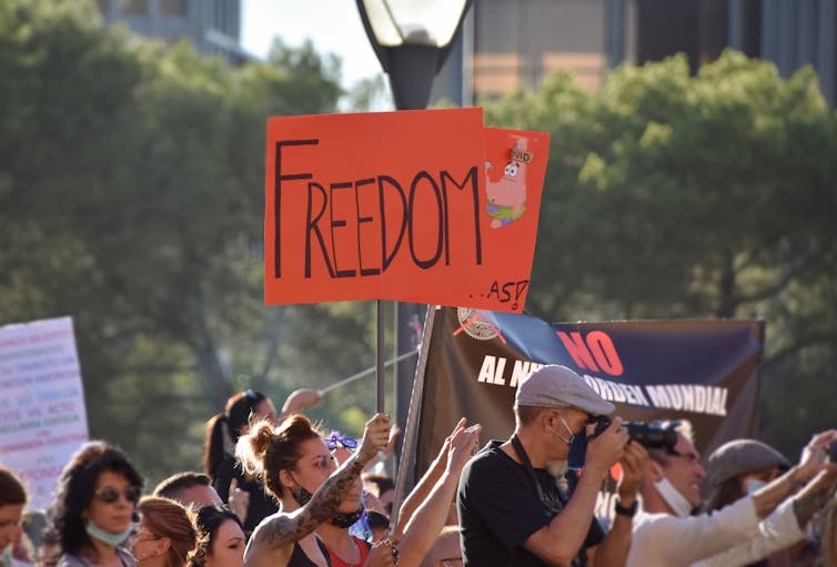 Aspecto de la manifestaci贸n contra las directrices sanitarias, como el uso obligatorio de mascarillas, en Madrid el 16 de agosto de 2020.