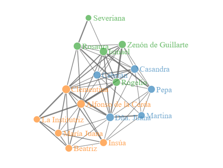 De este modo, un grafo de una obra de Echegaray o Galdós refleja una red social entre personajes menos compleja que la que observamos en las piezas dramáticas de Valle-Inclán, con grupos de personajes que solo interaccionan entre sí y no con el resto. O puede verse la importancia de diferentes personajes secundarios en obras de García Lorca, cuyas afluencias en escena llegan a coincidir, en la misma medida, entre ellos e incluso superar a la del protagonista.