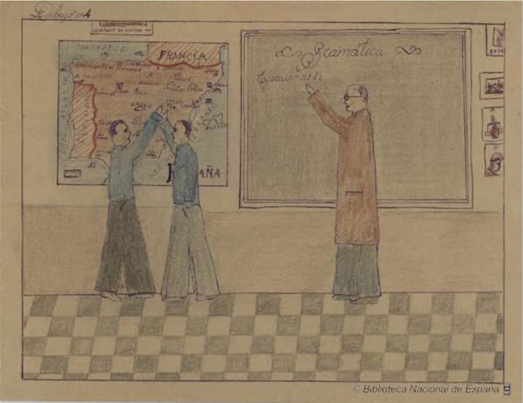 Dibujo hecho por Ram贸n Hern谩ndez Amig贸 a las 12 a帽os, en 1937. En el dibujo se lee: ‘Mi compa帽ero Dur谩n y yo mirando el curso de las operaciones en un mapa de Espa帽a, el se帽or maestro prepara los trabajos’