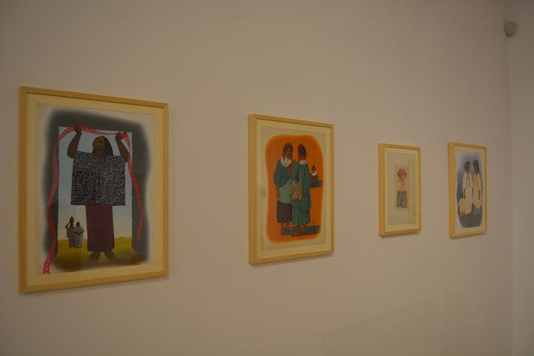 Imagen de varias pinturas en la exposición Manuela Ballester en el exilio. El traje popular mexicano del Museo Nacional de Cerámica en 2015. Ministerio de Cultura y Deporte