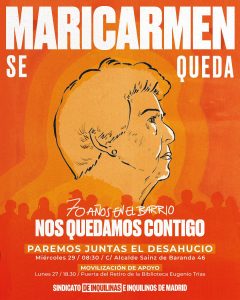 Maricarmen ha anunciado su decisión de permanecer en casa cueste lo que cueste. Organizada en el Sindicato, lleva más de un año en la estrategia #NosQuedamos contra los desahucios invisibles, convencida de que no sólo le asiste el derecho, sino que con ello impide que los nuevos propietarios puedan incrementar el precio del apartamento, agravando así la escalada de precios que sufre Madrid. Son ya cientos de inquilinas las que, cuando su casero les obliga a elegir entre una subida abusiva del precio o el abandono de la vivienda, se niegan a aceptar el chantaje y resisten en sus casas, pagando el mismo precio que venían abonando hasta entonces, o depositándolo ante el juzgado en el caso de que sea rechazado por el propietario. La estrategia #NosQuedamos es la única forma efectiva de frenar la escalada de los alquileres en ciudades que, como Madrid, se niegan a aplicar la regulación de precios prevista en la Ley de Vivienda estatal.