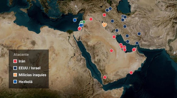 Los ataques iran铆es han tenido como objetivo tanto territorio israel铆 como instalaciones y posiciones vinculadas a Estados Unidos en varios pa铆ses de la regi贸n, entre ellos Bahr茅in, Qatar y Emiratos 脕rabes Unidos, adem谩s de la Embajada estadounidense en Riad, en Arabia Saud铆. Chipre tambi茅n ha denunciado da帽os limitados en una base brit谩nica tras el impacto de un dron de fabricaci贸n iran铆.
